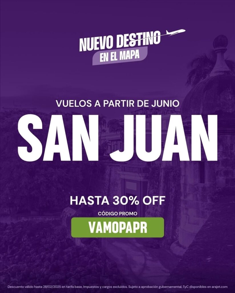 Para celebrar su llegada a San Juan, Arajet ha lanzado la promoción «VAMOPAPR», válida del 17 al 28 de febrero, ofreciendo un 30 % de descuento en vuelos desde y hacia San Juan para viajes entre junio de 2025 y marzo de 2026.