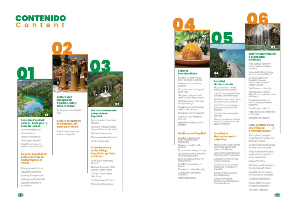 La publicación ofrece un recorrido por los principales atractivos naturales, culturales y gastronómicos de Espaillat, entre ellos: